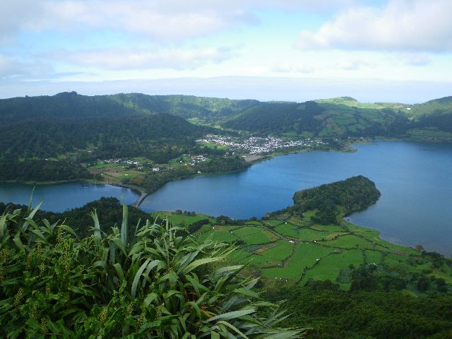 Eine der geographischen Hauptattraktionen Sao Miguels ist der Kratersee in „Sete Cidades„, dessen eine Hälfte grün, die andere blau schimmert. Wieder macht’s uns das Wetter schwer: vom Aussichtspunkt am Kraterrand ist der See zwar zu sehen, aber mangels Sonnenschein verbergen sich die sonst leuchtenden Farben. Insgesamt kommen wir viermal hierher, aber immer macht das Wetter den Kalenderfotos einen Strich durch die Rechnung. Egal, die Szene ist auch so beeindruckend.